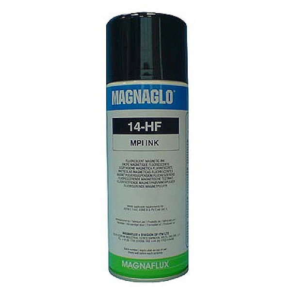 Аэрозоль Magnaglo 14HF используется для нанесения на проверяемые детали способом суспензии при магнитопорошковом контроле, для выявления поверхностных и подповерхностных дефектов в ферромагнитных материалах, путем полива или погружением объекта в ванну с магнитопорошковой суспензией, а также аэрозольным способом. Типичными найденными дефектами являются усадочные трещины, сварочные дефекты, шлифовочные трещины и трещины усталости. Магнитопорошковая суспензия дает ясный люминесцентный зеленый индикаторный рисунок, видимый в ультрафиолетовом свете при длине волны 365 нм. Магнитопорошковая суспензия должна быть хорошо перемешана как до начала ,так и во время работы.