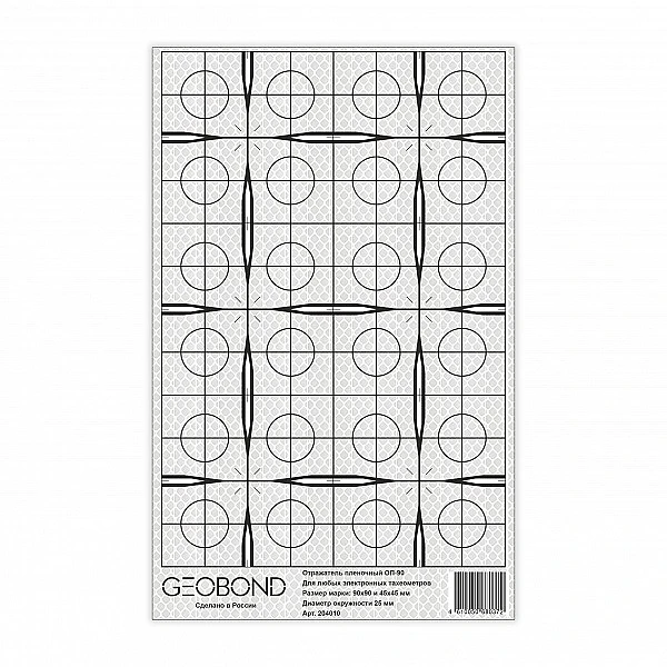 Отражатели Geobond ОП-90 имеют оригинальную форму, которая позволяет автономно использовать марку либо целиком (90 х 90 мм), либо 1/4 ее часть (45 х 45 мм). Это создает дополнительные удобства, т. к., приобретая всего один тип пленочного отражателя, пользователь имеет возможность, оптимально подбирать необходимый размер марки в зависимости от расстояний, на которых планируются измерения. К достоинствам разметки относятся бисекторные и контрбисекторные штрихи различной толщины, значительно упрощающие наведение на них, а также повышающие точность взятия углового отсчета при работе на больших расстояниях. Разметка пленочного отражателя нанесена специальной водостойкой краской, выдерживающей воздействия спирта и бензина, а сама пленка имеет гарантированный срок службы при уличной эксплуатации 10 лет.