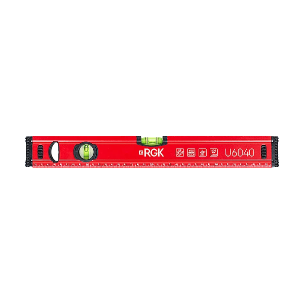 Строительный уровень RGK U6040 оборудован 2 капсулами для контроля положения вертикальных и горизонтальных конструкций. При производстве рабочая плоскость подвергается фрезеровке, благодаря чему становится идеально ровной.